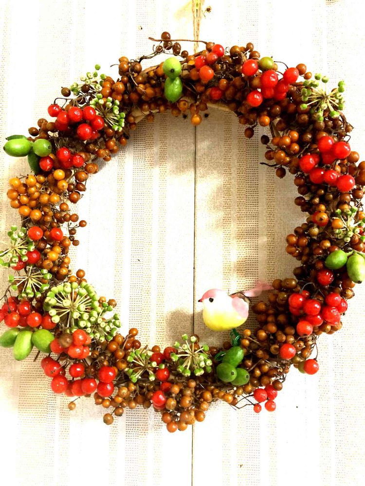 お散歩しながら、秋の実を沢山集めてみましたよ👍小さいリースは、小鳥さんのために外に飾りました💕