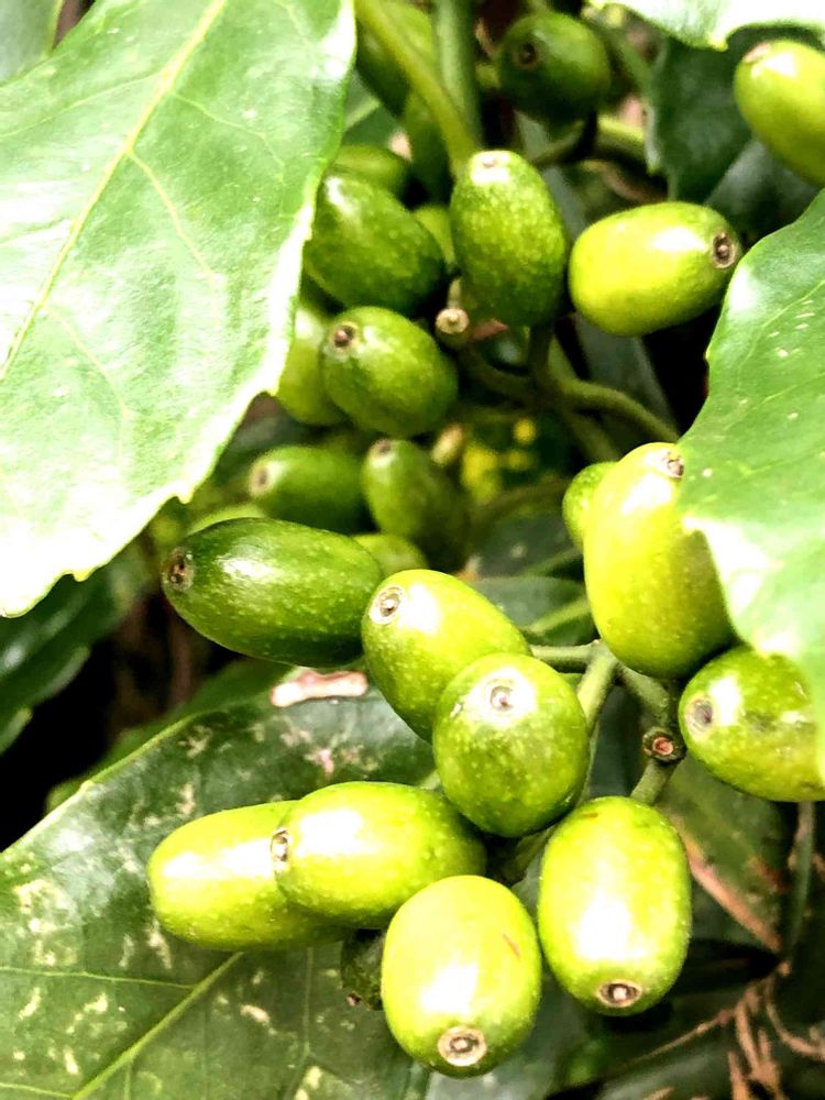山の中では、青木(アオキ)の実もいきいきして、いっぱい実っていました。ライムグリーンから赤へと色が変わっていきます。