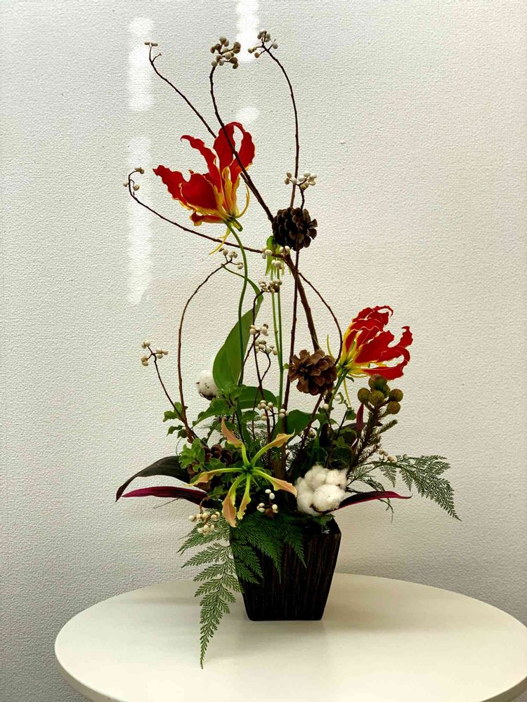 生け花と違い枝ぶりを活かすのでは無くアレンジメントのテーマの型を決めて作っていくというような課題でした。