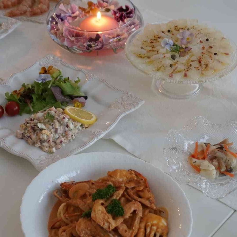 エディブルフラワーのビオラも、サラダやカルパッチョ、エビなどにのせるだけで