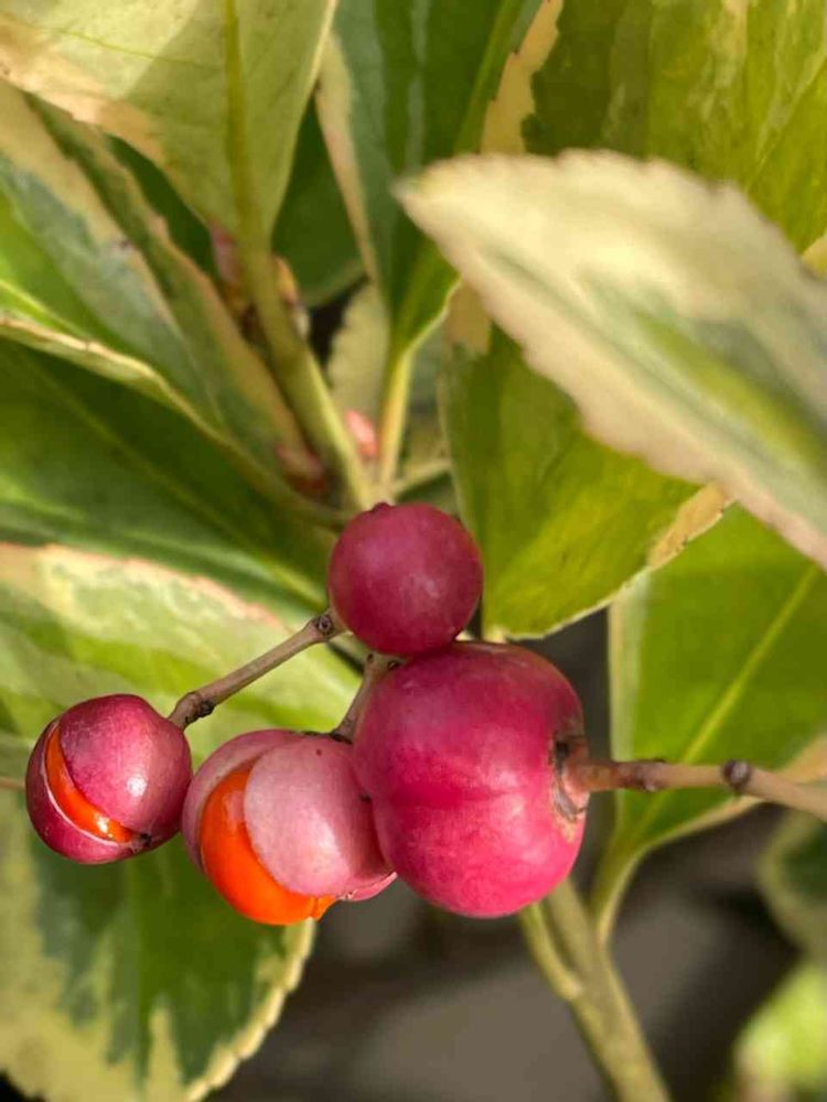 裂開して橙赤色の仮種皮に包まれた種が顔を出しています❤️❤️❤️