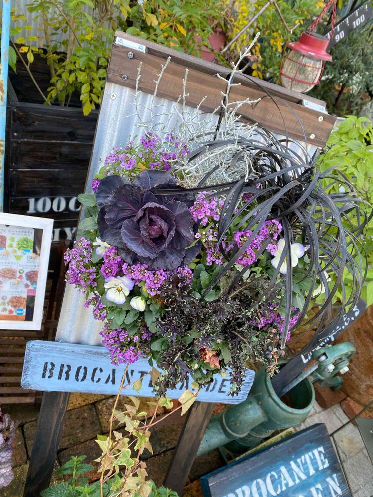 アリッサム、ビオラ、アンティーク葉牡丹、プラチーナ、家にあった黒龍とヘデラを合わせてみました。