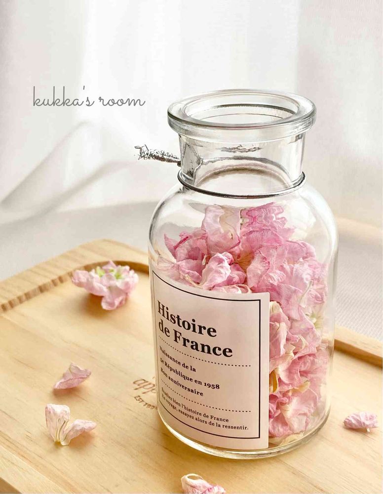 私も同じ小瓶にストックのドライになった花びらを入れて飾っているの〜💕