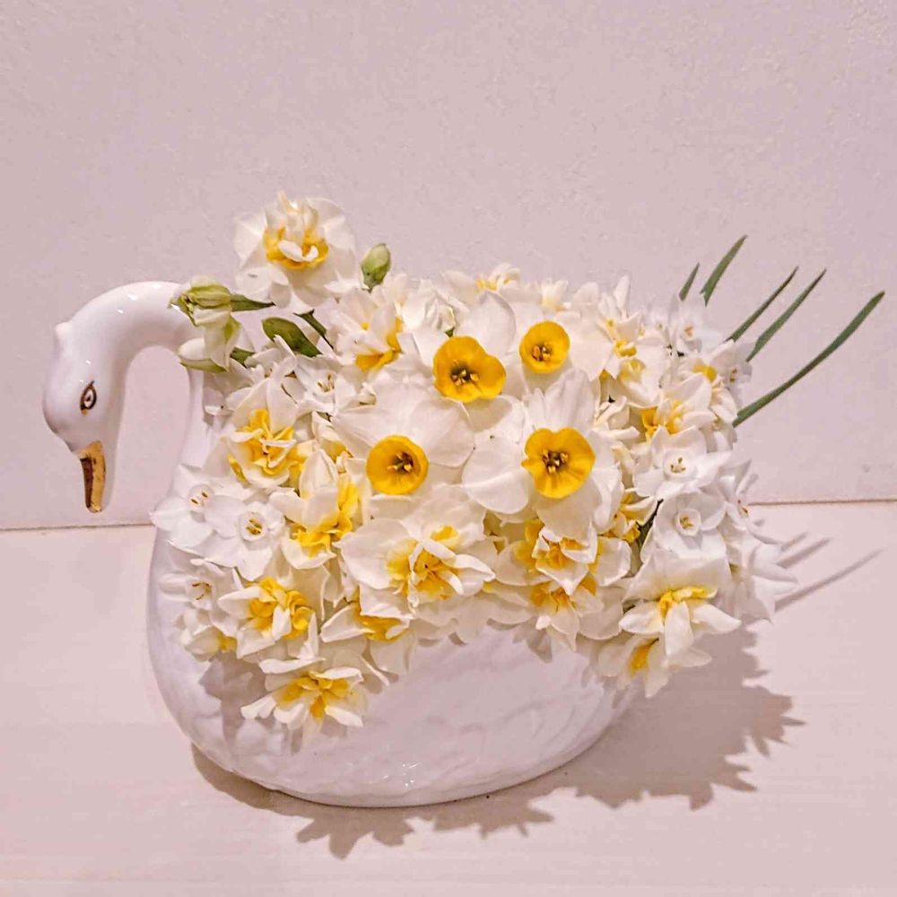 水仙が白鳥の羽に飾られてて、ドレスアップしてるようで素敵ですね🦢✨💠