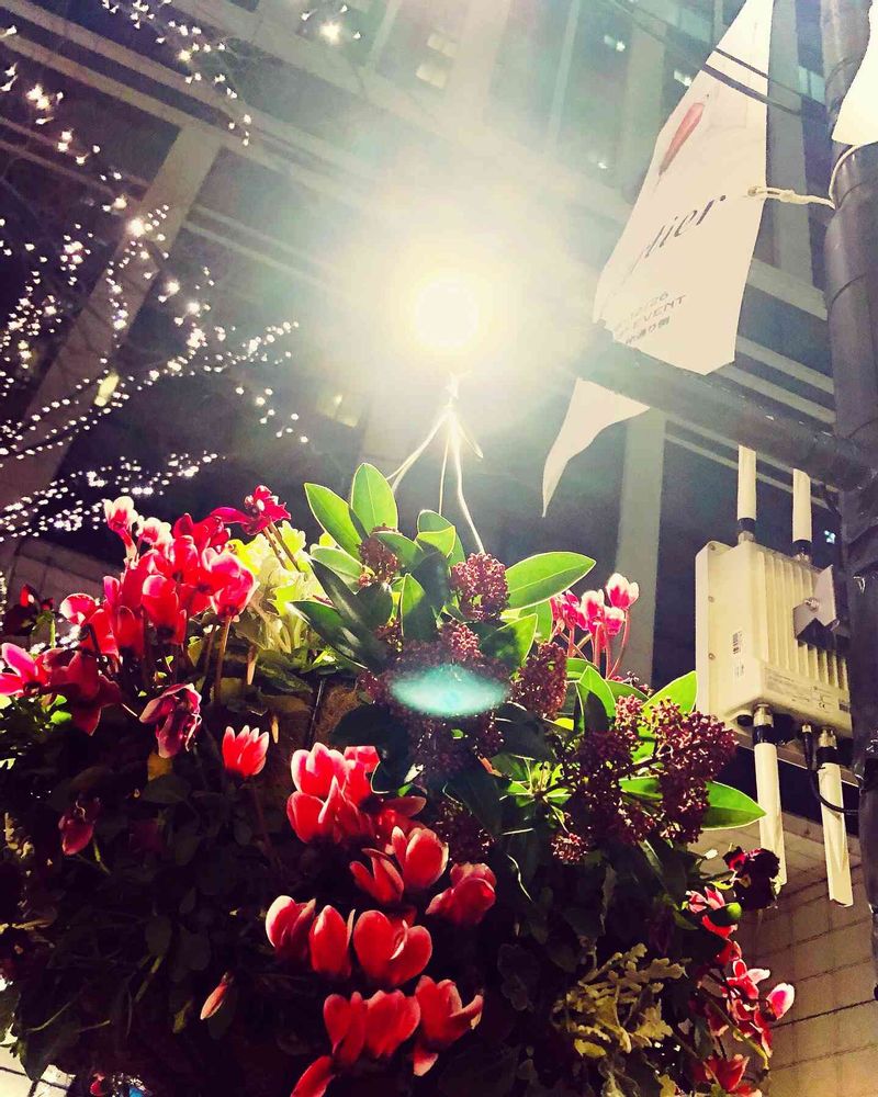 見上げるほど高い位置にお花のバスケット発見💐光に照らされていてすごく素敵