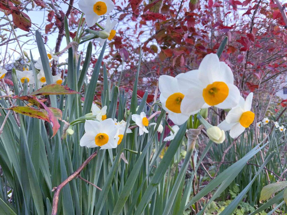 紅葉したブルーベリーの背景がイイ感じに水仙を引き立てていますね❣️