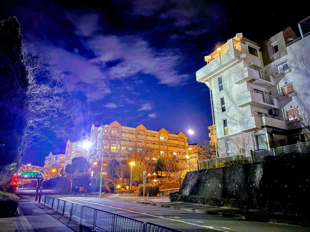 ここでは月は団地の合間を低空で照らし、左側にある街灯の方が、はるかに大きくてあかるい