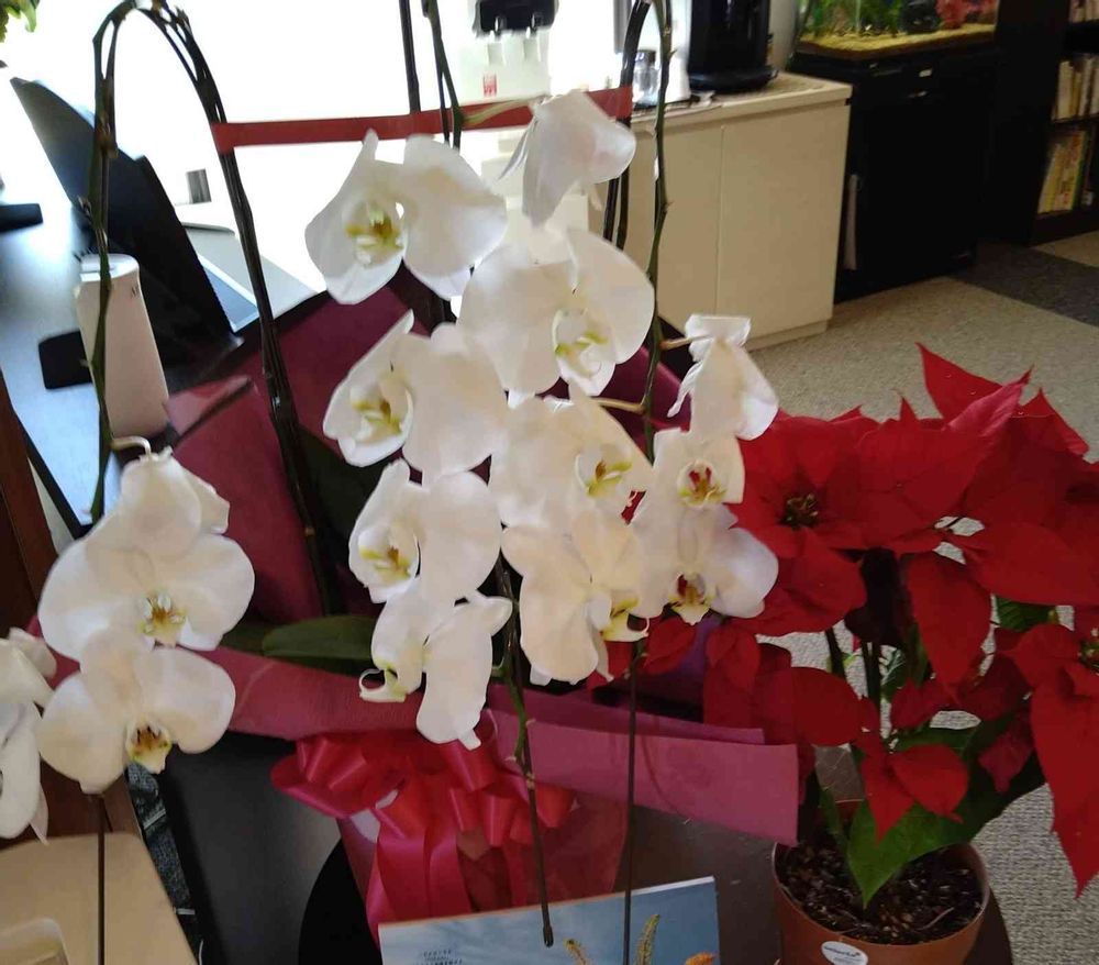 ロビーの花も赤いポインセチアと白いコチョウランで華やかでした。