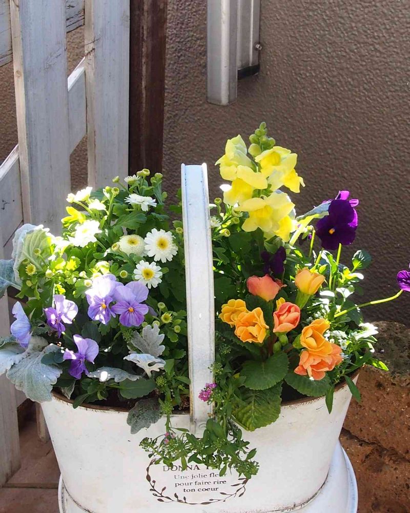 持ち手付きのブリキに♪ビオラ、ジュリアンの寄せ植え