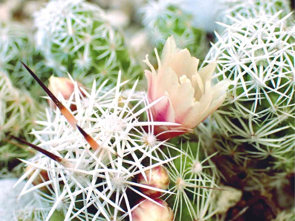 銀手毬(ギンテマリ)は、ミニサボテンで、直径2cm〜3cmほどで、花色は黄色がかった白い花、入手時よりも株が増えたようです。