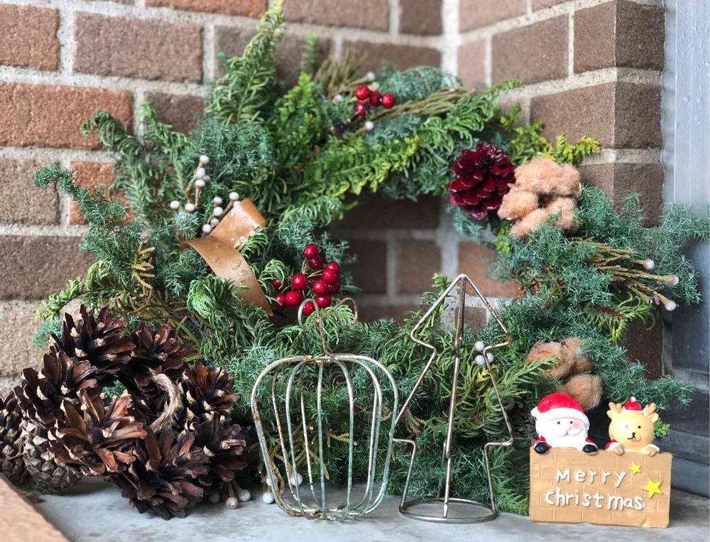 花材は拾い集めた小枝や木の実、100均のリース土台などで良いと思います。強風の翌朝の散歩がオススメです😄