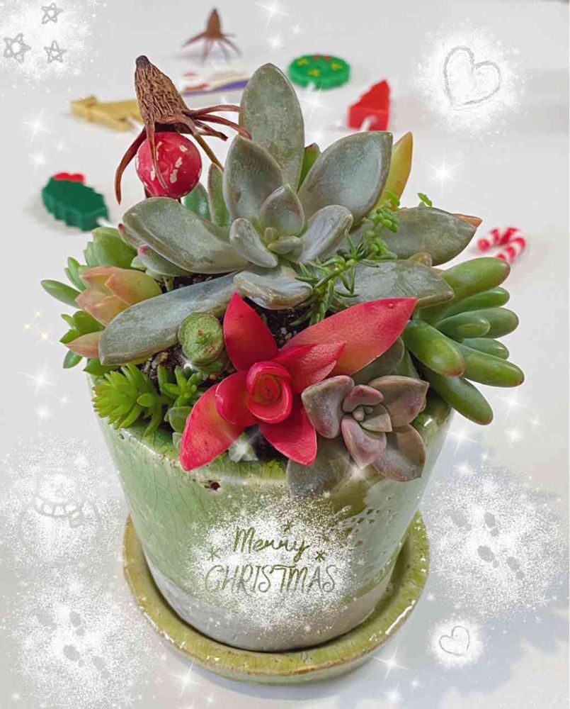 だって鉢の色まで可愛いカエル色よ✨赤とグリーンがバランスよく小さなX'masツリー✨🎄✨のようね😆でも 気になるのが上にチョコンと乗ったクレクレタコラ🐙💨