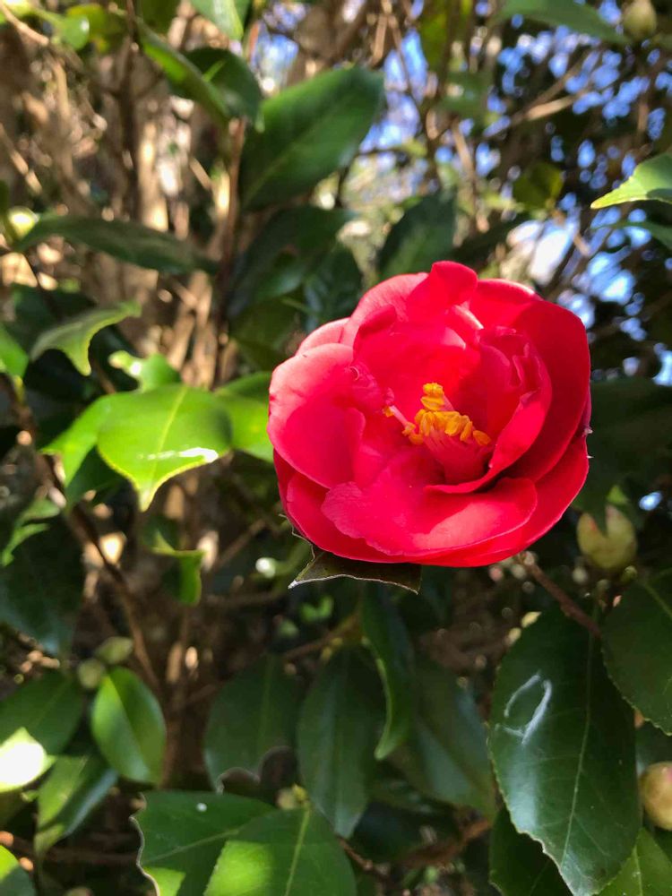 一緒に撮ったヤブツバキにしようか迷いましたが、ヤブツバキはあまりにも貧弱だったのでこちらにしました。詳細な品種名は不明です😅。花はともかく、葉っぱの緑色、光沢、厚さどれもすごいです😊。昔の人も葉っぱが貧弱ならここまで愛でることは無かったと思います。