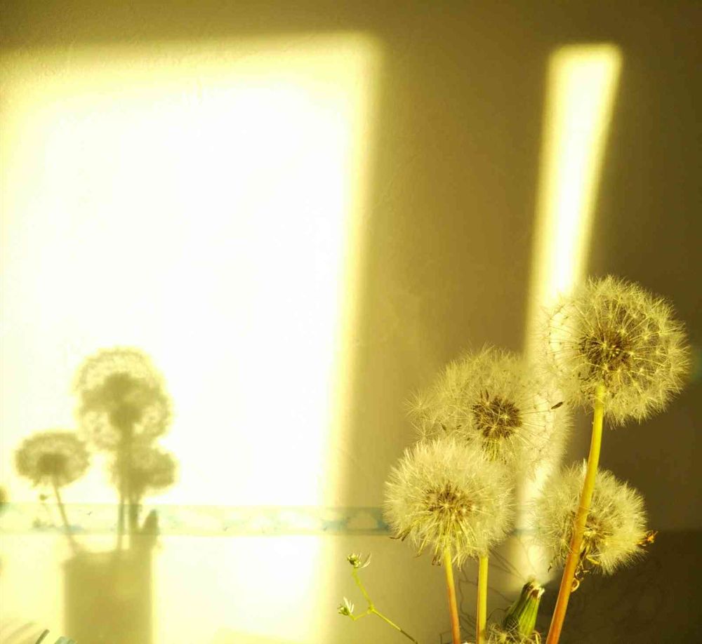 家の中に西日が射し込み、タンポポの綿毛のシルエットが壁に✨✨