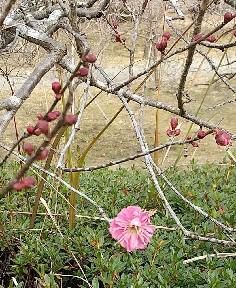昨日、ロウバイを見に行ったのですか、梅のお花がひとつ咲いていました。