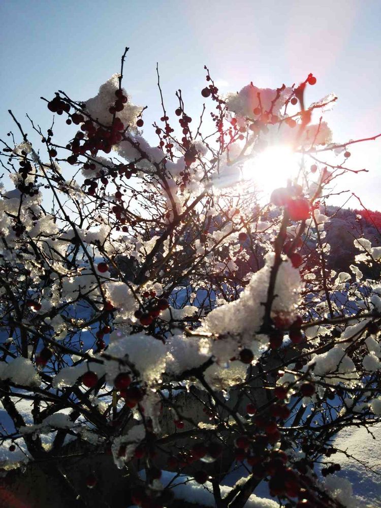 散歩前🎵準備運動😊冷え「ウメモドキ」シャーベット状態、朝陽がじんわり溶かします。