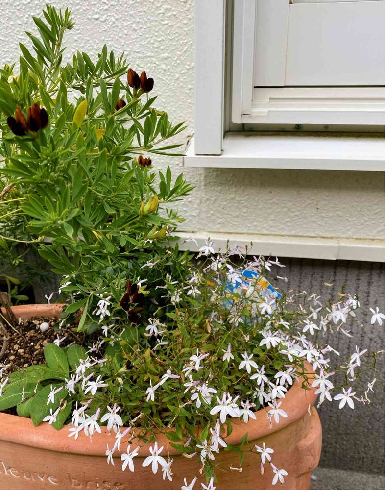 地植えのロータスブラックムーニーは先週辺りから枯れてきたのでガッツリ切ってしまいました。こちら軒下の鉢植えの方はまだ緑色をして花もちらほらꕤ*.゚地植えもそのままにしておけばよかったかも。。