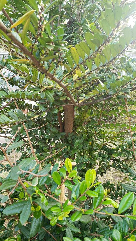 これはなんの木でしょうか?葉の裏に小さな花と丸い実がついています。花のにおいがとても臭い!ひさかきの花に花のつき方、においが似ていますが葉っぱが違います。
