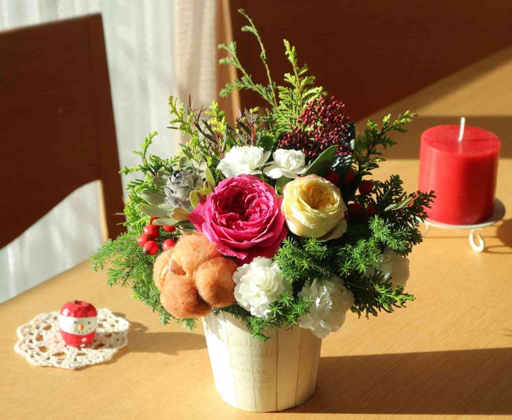 ピンクやイエローのバラや、スキミア、カーネーションを使ったクリスマスアレンジ✨🎄✨