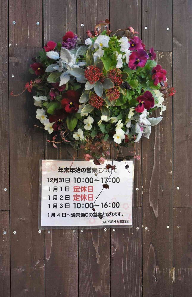 ガーデンメッセは年内12月31日まで、年始は1月3日からの営業です。私は26日(日)の出勤です。寄せ植えのご注文お待ち申し上げております。