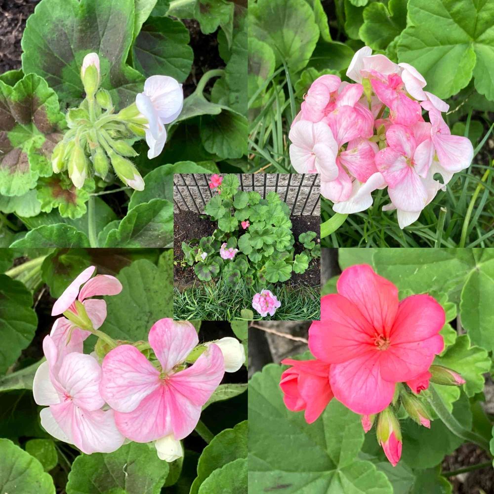 ゼラニウム。真ん中の株の各花を周りに並べてみました。どれも可憐で捨てがたい😊特にピンクと一言で言えない↗️と↙️は惚れ惚れしてしまいます。この花を撮っている時持ち主の母親らしき方が話しかけてこられ、しばらく花談義をしました。