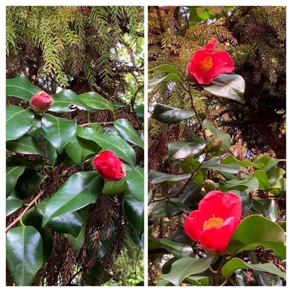 朱色に近い明るい椿は、ハッとする素敵な、椿ですね。
