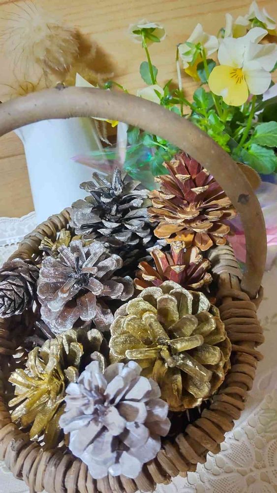 山で拾った松ぼっくり。リースを作る時に張り切って沢山カラースプレーしたけど、余ってしまって💦