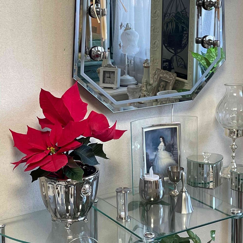 壁掛け仏壇「鏡壇ミラリエ」に今日(12/25)の誕生花の「赤いポインセチア(猩々木)」を飾ってみました。