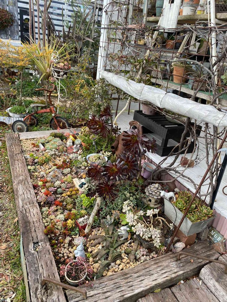 本当にベンチがあったり他の鉢が沢山あります。吊るされているものもありましたしビン、缶ハウス型の鉢も。