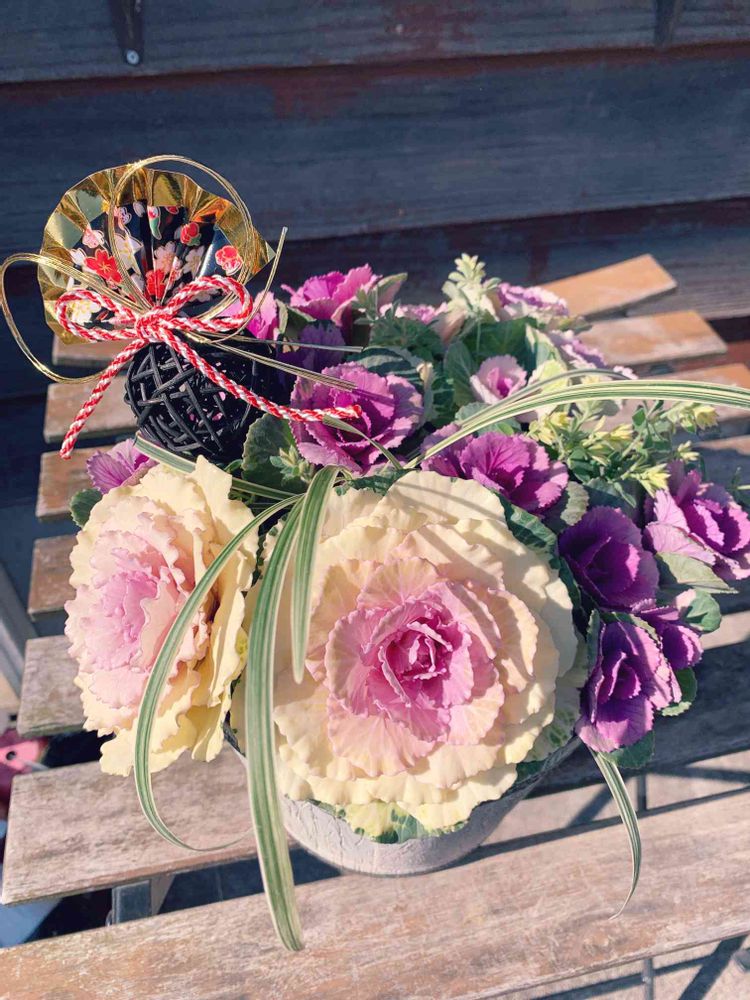 今年最後に頼まれて作った新年風味のハボタン寄せ植え