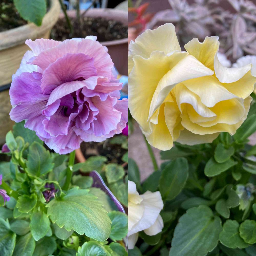 鉢植え,藤色の花,クリーム色の花の投稿画像