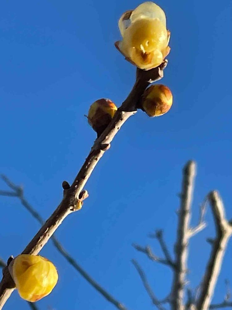 葉を落とし、開花の瞬間を静かに待っている素心蝋梅🌼