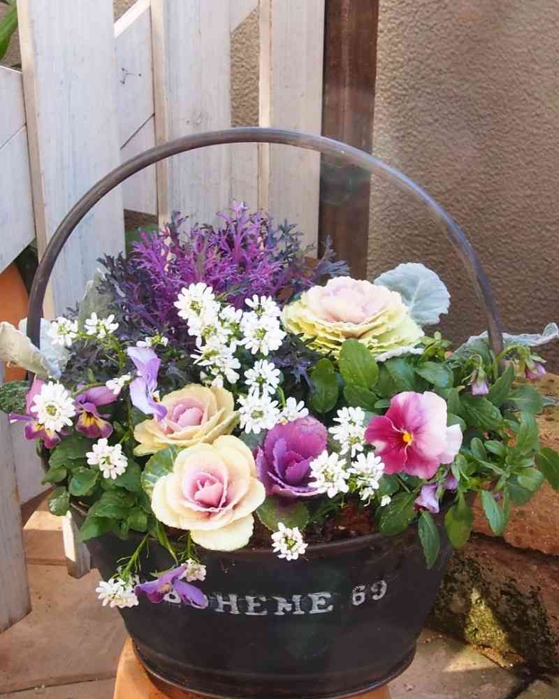 持ち手付きのブラックブリキに♪ハボタンの
