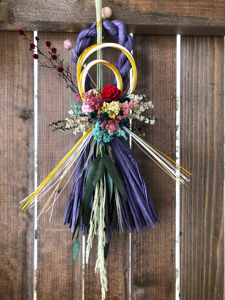 我が家、100均で買ったしめ縄からのアレンジを考えているんですが、紫色ベースの縄も水引きの感じも、飾りの配置や色合いも、最高にいい感じです👍👍。