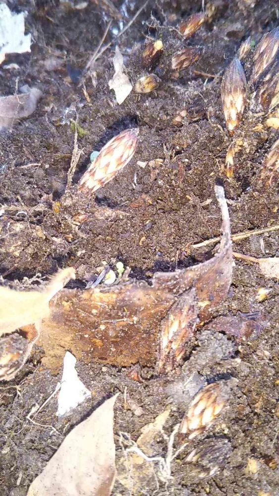 山の斜面にある実家の庭(ほぼ山の続き)の落ち葉掻き。落ち葉と腐葉土を掻き出した下から「土筆」らしきものが出てきました。落ち葉の布団の中でじっと春を待っているところだったみたい。