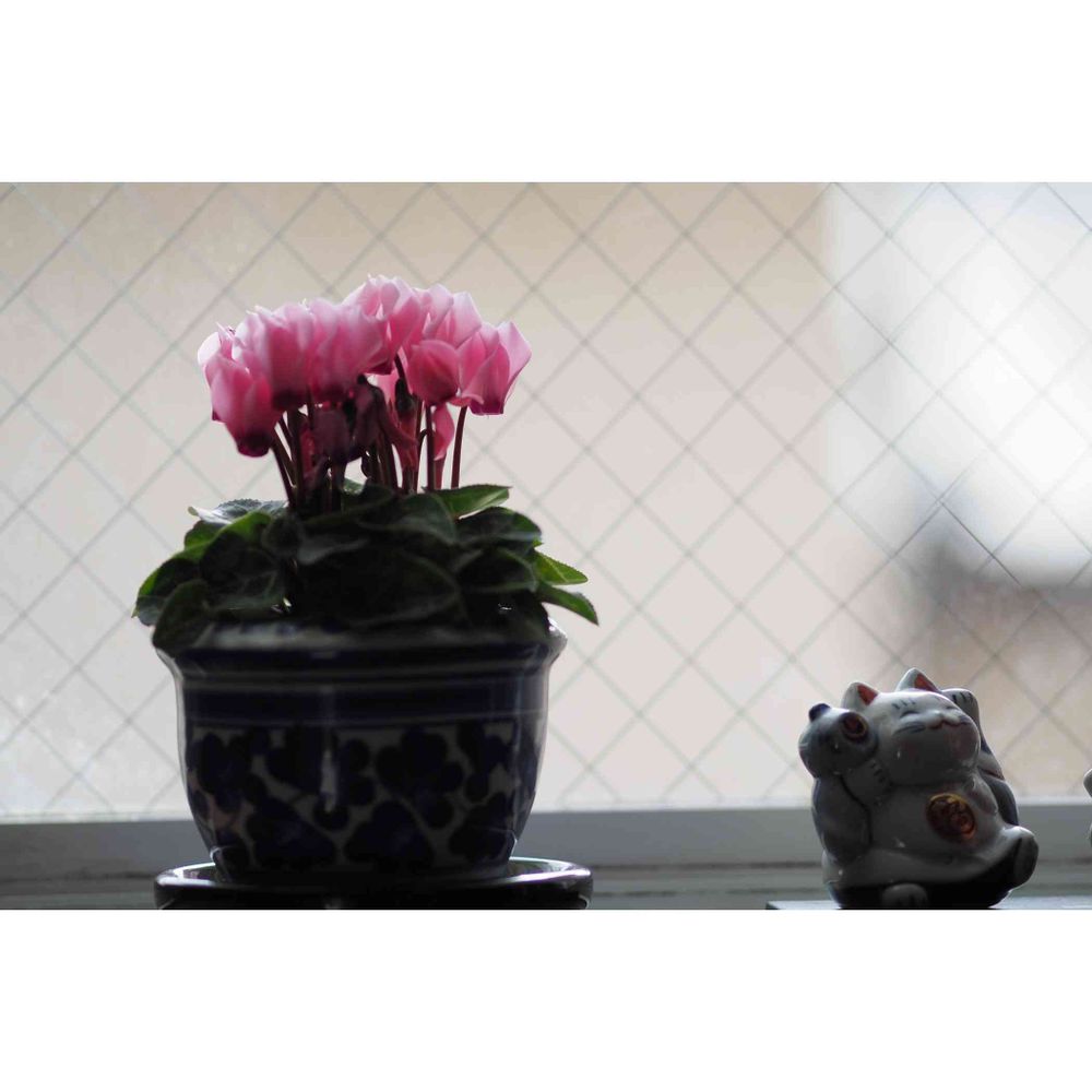 小さなガーデンシクラメンが余りに綺麗に咲いていたので、鉢カバーをして室内の窓辺に置いてみました!!
