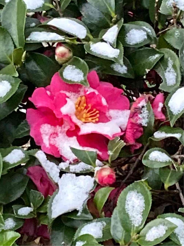 山茶花に積もった❄️が一緒に見えます😆🤗💖