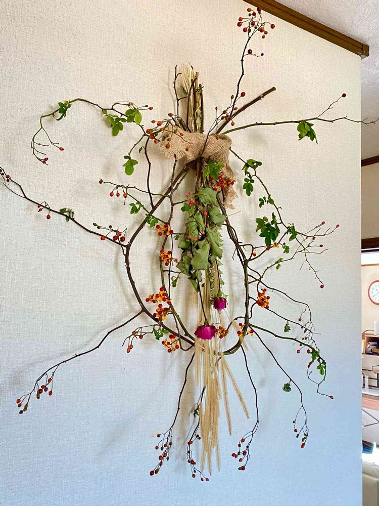 ノイバラの枝を2本グルっと巻いて、ドライになった植物を少々、簡単なものですけど、野生的なところが、気に入っています。