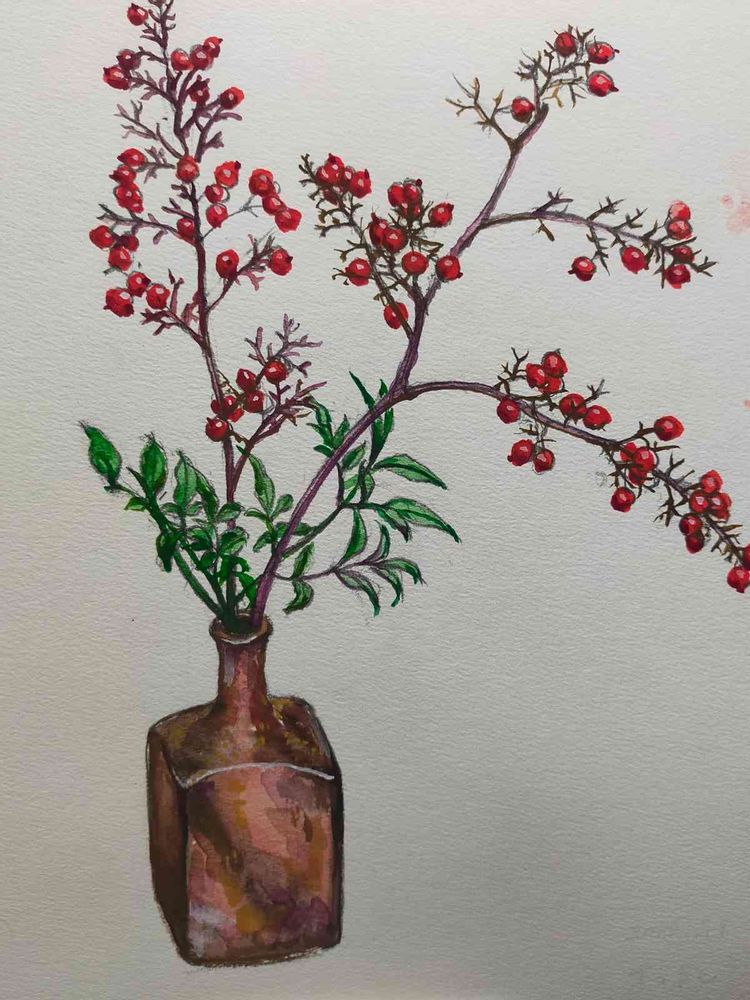 素晴らしい、南天?90点、葉っぱの色、花瓶の素焼き感が減点かな。すみません絵も描いてもいたいのに、失礼な事言って。南天の実は、120点トータルで100点、これからも宜しくお願いします🤲🥺