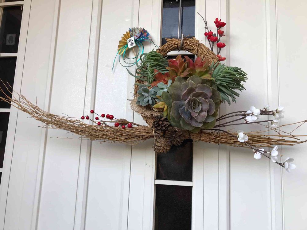 今年最後の大安日、玄関ドアのリースを多肉の正月飾りに替えました。