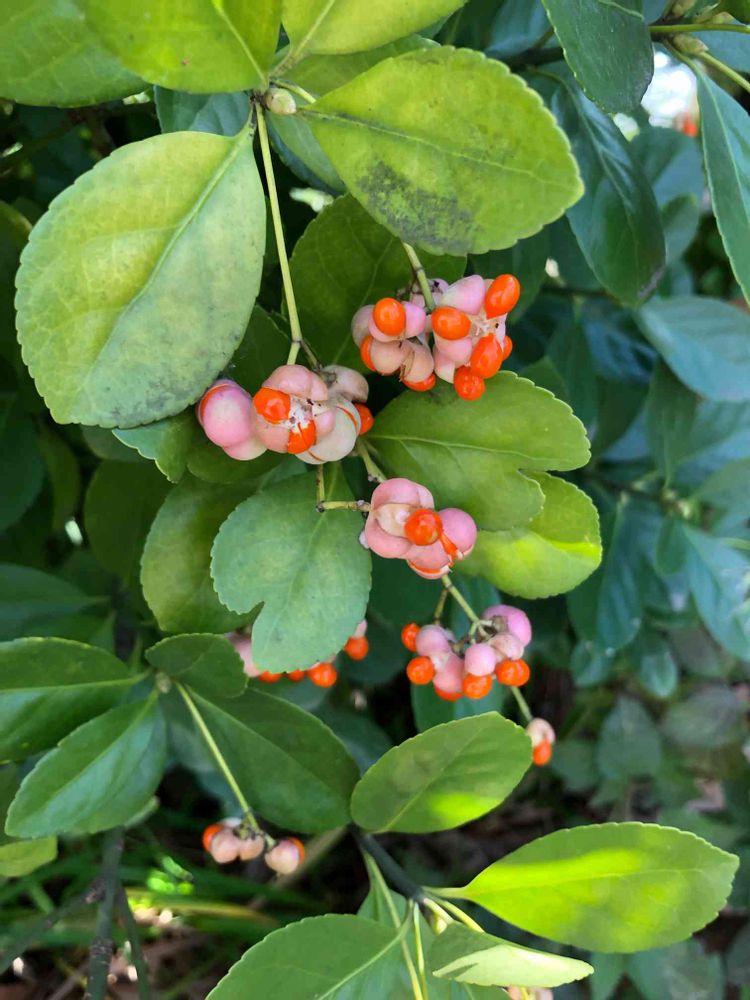 ピンク色の実から鮮やかなオレンジ色の種が弾けてきました🥰