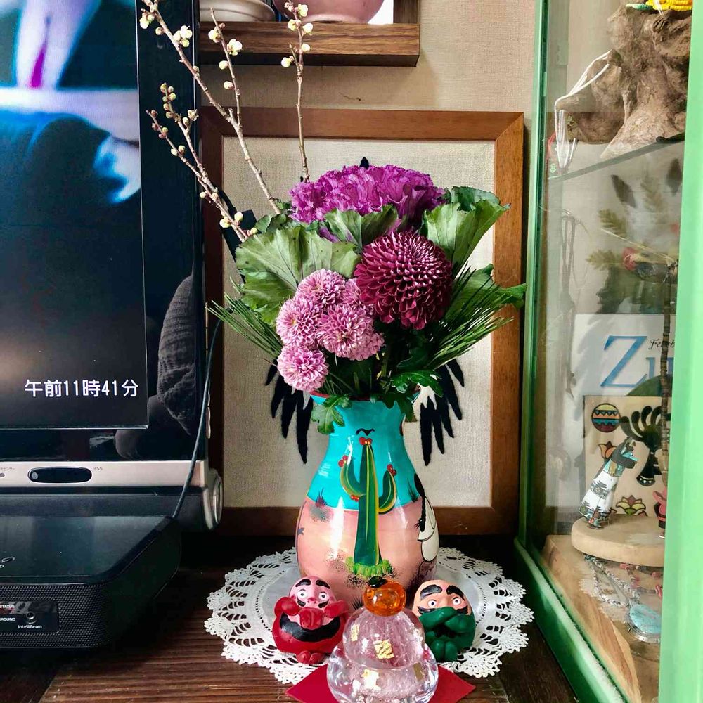 今年の葉牡丹とポンポン菊はパープル系に。梅の蕾を添えて…