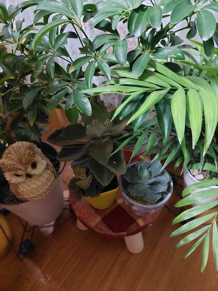 室内に避難した左からカポック🌿とファングと雷神とテーブルヤシ🌿と🦉です💕