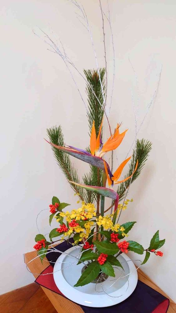 今年最後のお稽古のお正月花は、花器との大きさのバランスを無視して大きく盛ってみました。