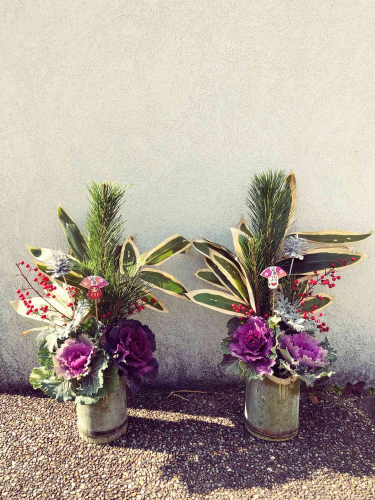 未完成だった門松に南天の実と庭の笹、ピックを挿して仕上げました。