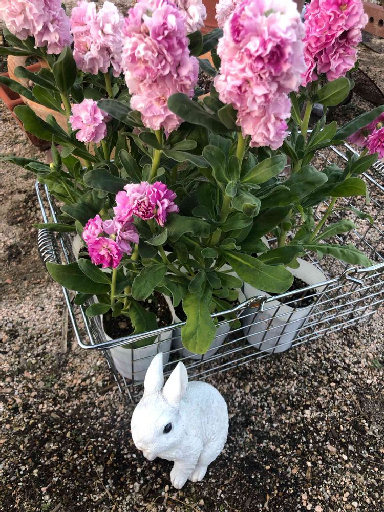 先程…野菜を持って師匠の家を訪ねたら、またもや事件発生‼️私が大好きなストックと可愛いうさぎの置物をいただきました🎁いつもありがとうございます😊