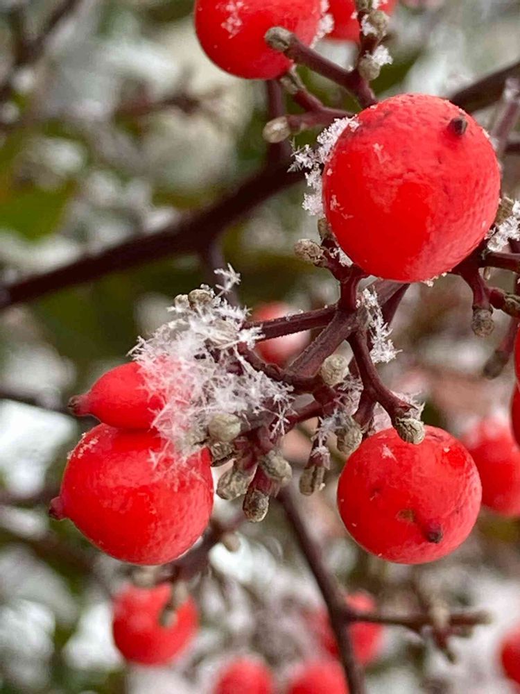 実家の南天。風もなくて、雪の結晶がよく見えます。