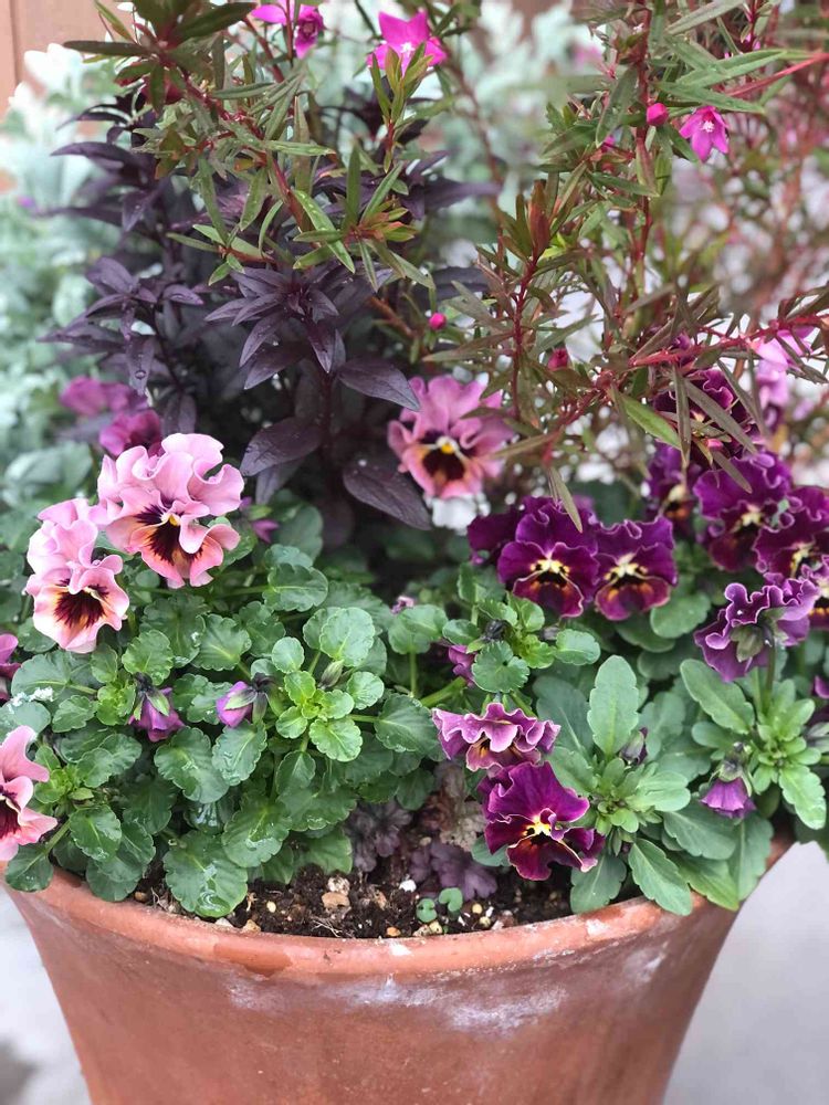 ビオラ×ビオラにしなくてもよかったのにって反省中です。ダメですね〜可愛いと思った苗を買って帰ってから鉢と相談して組み立てるからこうなります😅