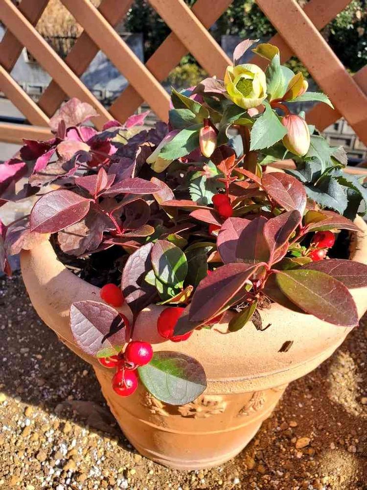 チェッカーベリー、ヒューケラ、クリスマスローズの寄せ植え🥰