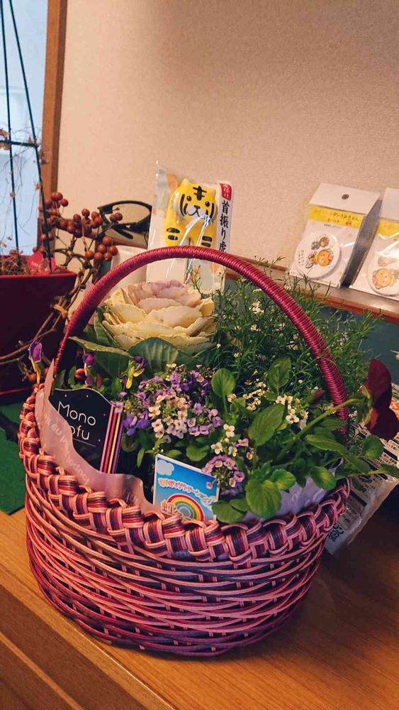 太陽市(おひさまいち)で可愛い籠とお花を見つけたので衝動買い🌸籠だけでもまぁまぁなお値段だけど、、めっちゃリーズナブルなお値段に飛び付きました💦